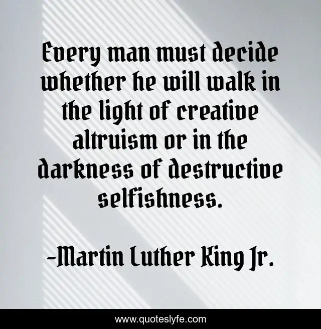 This page presents the quote "Every man must decide whether he will walk in the light of creative altruism or in the darkness of destructive selfishness.". Author of this quote is Martin Luther King Jr.. This quote is about benevolence, integrity, charity,.