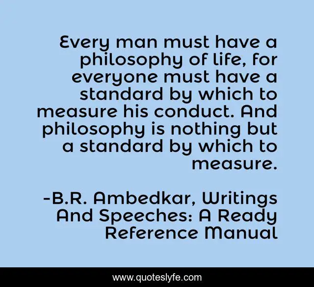 This page presents the quote "Every man must have a philosophy of life, for everyone must have a standard by which to measure his conduct. And philosophy is nothing but a standard by which to measure.". Author of this quote is B.R. Ambedkar, Writings And Speeches: A Ready Reference Manual. This quote is about philosophy-of-life, humanity-and-society,.