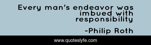 This page presents the quote "Every man's endeavor was imbued with responsibility". Author of this quote is Philip Roth. This quote is about enthusiasm, strength, responsibility, inspirational, strong,.