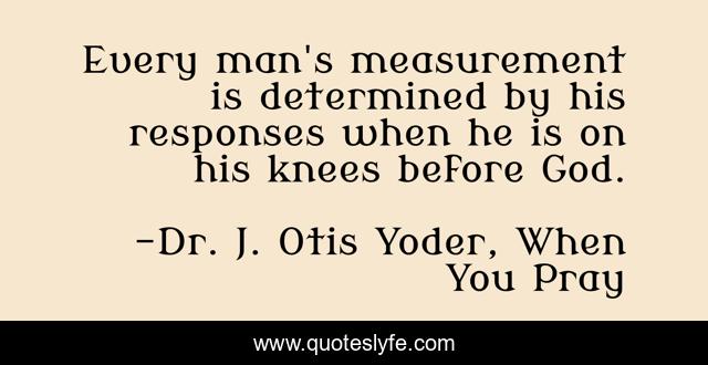 This page presents the quote "Every man's measurement is determined by his responses when he is on his knees before God.". Author of this quote is Dr. J. Otis Yoder, When You Pray. This quote is about knees, manliness, pray, god, men, measure-of-a-man, humility, kneel, man,.