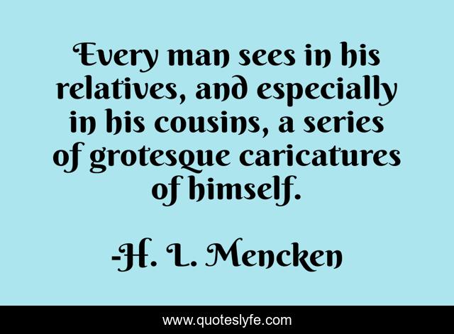 This page presents the quote "Every man sees in his relatives, and especially in his cousins, a series of grotesque caricatures of himself.". Author of this quote is H. L. Mencken. This quote is about cousins, relatives, man,.