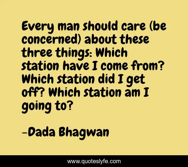 This page presents the quote "Every man should care (be concerned) about these three things: Which station have I come from? Which station did I get off? Which station am I going to?". Author of this quote is Dada Bhagwan. This quote is about show-concern, spiritual, care, purpose, goal,.