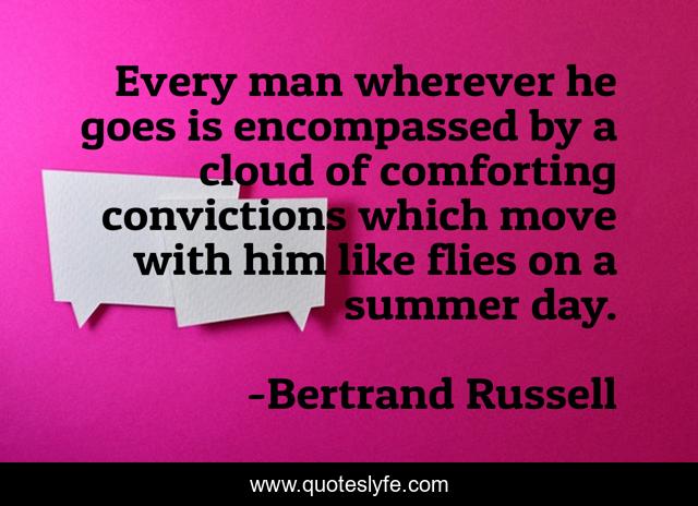 This page presents the quote "Every man wherever he goes is encompassed by a cloud of comforting convictions which move with him like flies on a summer day.". Author of this quote is Bertrand Russell. This quote is about belief, conviction,.
