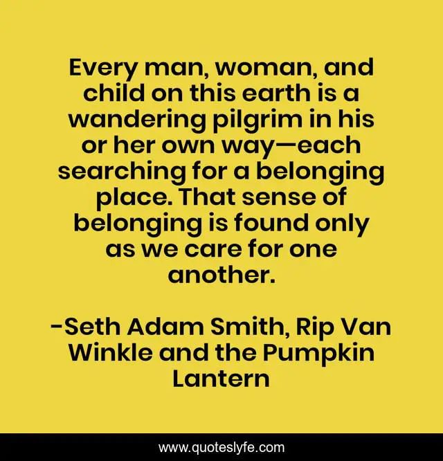 This page presents the quote "Every man, woman, and child on this earth is a wandering pilgrim in his or her own way—each searching for a belonging place. That sense of belonging is found only as we care for one another.". Author of this quote is Seth Adam Smith, Rip Van Winkle and the Pumpkin Lantern. This quote is about pilgrim, care-for-others, home, belonging-place, america, wandering,.
