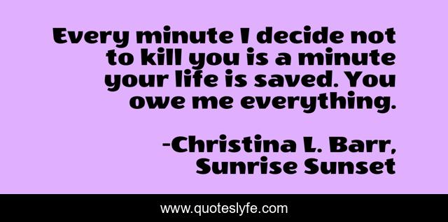This page presents the quote "Every minute I decide not to kill you is a minute your life is saved. You owe me everything.". Author of this quote is Christina L. Barr, Sunrise Sunset. This quote is about contemporary-fantasy, romance, sci-fi-fantasy, fiction,.