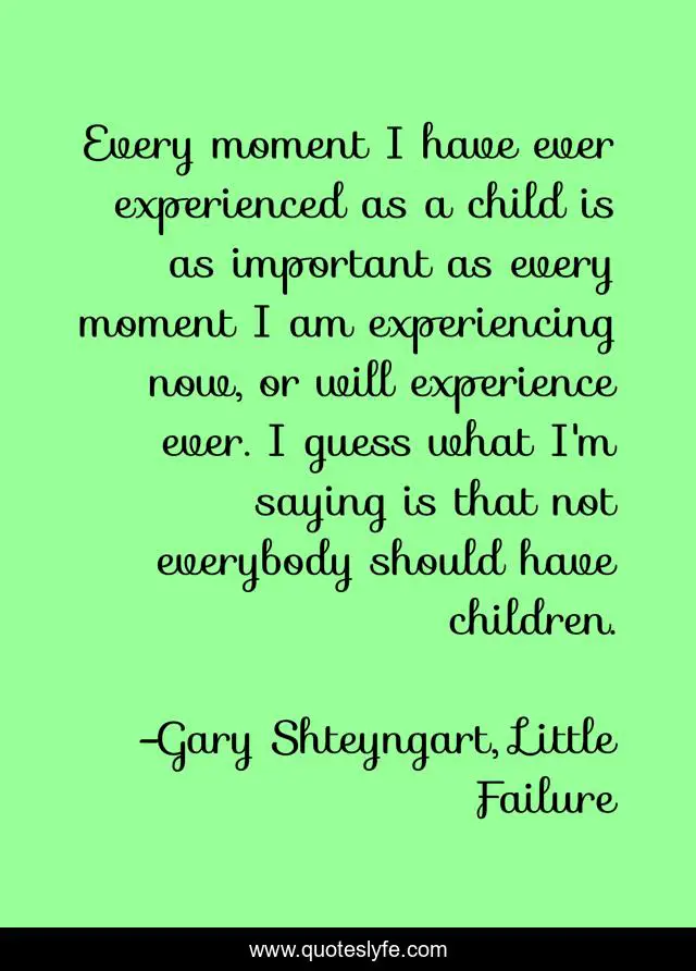 This page presents the quote "Every moment I have ever experienced as a child is as important as every moment I am experiencing now, or will experience ever. I guess what I'm saying is that not everybody should have children.". Author of this quote is Gary Shteyngart, Little Failure. This quote is about parenthood, life, childhood, experience, children,.