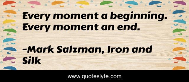 This page presents the quote "Every moment a beginning. Every moment an end.". Author of this quote is Mark Salzman, Iron and Silk. This quote is about patience, moment, now, happiness,.