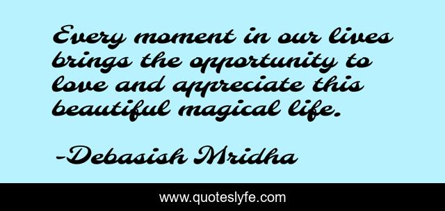 This page presents the quote "Every moment in our lives brings the opportunity to love and appreciate this beautiful magical life.". Author of this quote is Debasish Mridha. This quote is about debasish, magical-life, mridha, every-moment-of-our-lives, philosophy, debasish-mridha, appreciate-life, opportunity-to-love, appreciate-this-beautiful-life,.