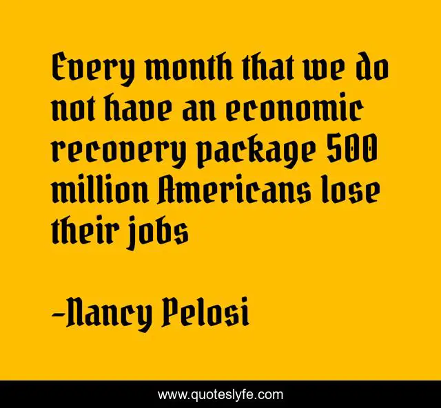 This page presents the quote "Every month that we do not have an economic recovery package 500 million Americans lose their jobs". Author of this quote is Nancy Pelosi. This quote is about gaffe, wrong, mistakes, dumb, statistic,.