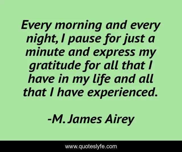 This page presents the quote "Every morning and every night, I pause for just a minute and express my gratitude for all that I have in my life and all that I have experienced.". Author of this quote is M. James Airey. This quote is about gratitude, thoughtful, grateful, inspiration,.