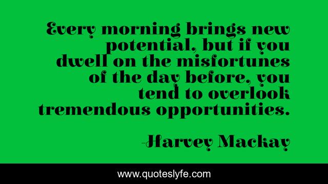 This page presents the quote "Every morning brings new potential, but if you dwell on the misfortunes of the day before, you tend to overlook tremendous opportunities.". Author of this quote is Harvey Mackay. This quote is about day, opportunities,.