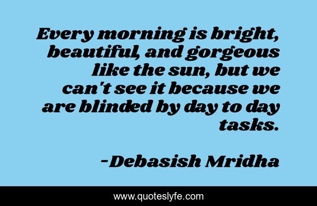 This page presents the quote "Every morning is bright, beautiful, and gorgeous like the sun, but we can't see it because we are blinded by day to day tasks.". Author of this quote is Debasish Mridha. This quote is about beautiful, blinded, life, tasks, love, knowledge, inspirational, intelligence, philosophy,.