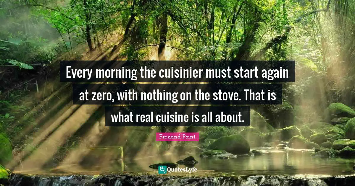 This page presents the quote "Every morning the cuisinier must start again at zero, with nothing on the stove. That is what real cuisine is all about.". Author of this quote is Fernand Point. This quote is about cuisine, real, every morning, morning, zero,.