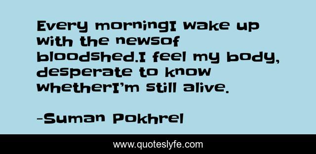 This page presents the quote "Every morningI wake up with the newsof bloodshed.I feel my body, desperate to know whetherI’m still alive.". Author of this quote is Suman Pokhrel. This quote is about terror, terrorism,.