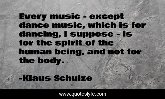 This page presents the quote "Every music - except dance music, which is for dancing, I suppose - is for the spirit of the human being, and not for the body.". Author of this quote is Klaus Schulze. This quote is about dance, body, human,.
