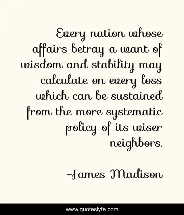 This page presents the quote "Every nation whose affairs betray a want of wisdom and stability may calculate on every loss which can be sustained from the more systematic policy of its wiser neighbors.". Author of this quote is James Madison. This quote is about neighbors, loss,.