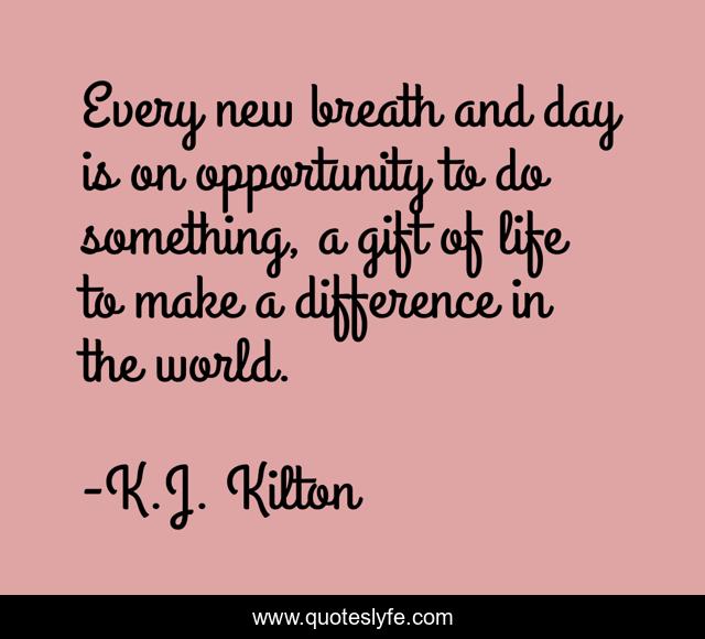 This page presents the quote "Every new breath and day is on opportunity to do something, a gift of life to make a difference in the world.". Author of this quote is K.J. Kilton. This quote is about breath, difference, opportunity, gift-of-life,.