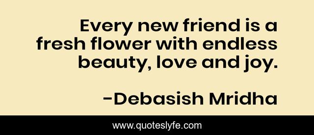 This page presents the quote "Every new friend is a fresh flower with endless beauty, love and joy.". Author of this quote is Debasish Mridha. This quote is about new-friend, debasish, love, fresh-flower, joy, endless-beauty, debasish-mridha, philosophy, mridha,.