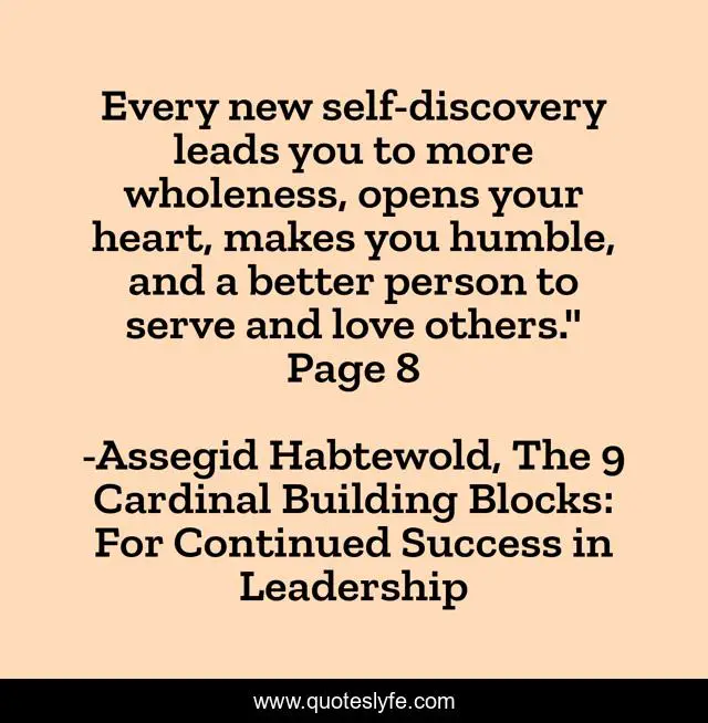 This page presents the quote "Every new self-discovery leads you to more wholeness, opens your heart, makes you humble, and a better person to serve and love others." Page 8". Author of this quote is Assegid Habtewold, The 9 Cardinal Building Blocks: For Continued Success in Leadership. This quote is about humble, self-discovery, love-others, serve-others, wholeness, open-heart,.