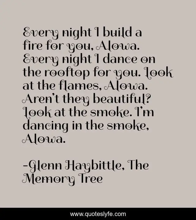 This page presents the quote "Every night I build a fire for you, Alowa. Every night I dance on the rooftop for you. Look at the flames, Alowa. Aren’t they beautiful? Look at the smoke. I’m dancing in the smoke, Alowa.". Author of this quote is Glenn Haybittle, The Memory Tree. .