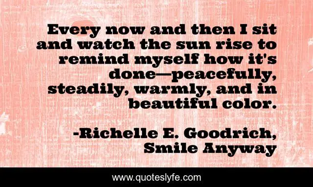 This page presents the quote "Every now and then I sit and watch the sun rise to remind myself how it's done—peacefully, steadily, warmly, and in beautiful color.". Author of this quote is Richelle E. Goodrich, Smile Anyway. This quote is about advance, perform, move-ahead, accomplishments, richelle, achieve, progress, richelle-goodrich, sunrise,.