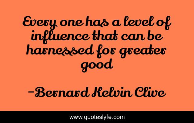 This page presents the quote "Every one has a level of influence that can be harnessed for greater good". Author of this quote is Bernard Kelvin Clive. This quote is about personal-branding, brand-ambassador, influence, brand-positioning, self-worth,.