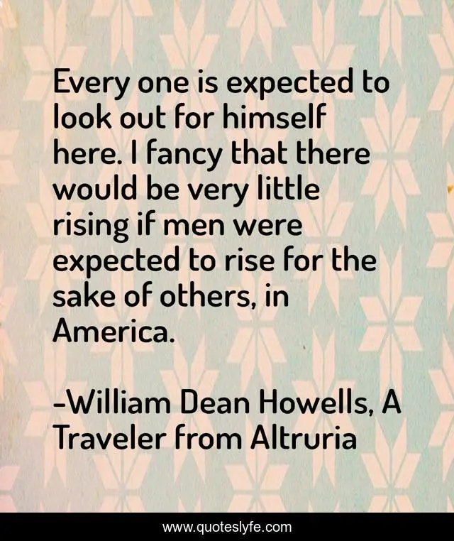 This page presents the quote "Every one is expected to look out for himself here. I fancy that there would be very little rising if men were expected to rise for the sake of others, in America.". Author of this quote is William Dean Howells, A Traveler from Altruria. This quote is about capitalism, individualism,.