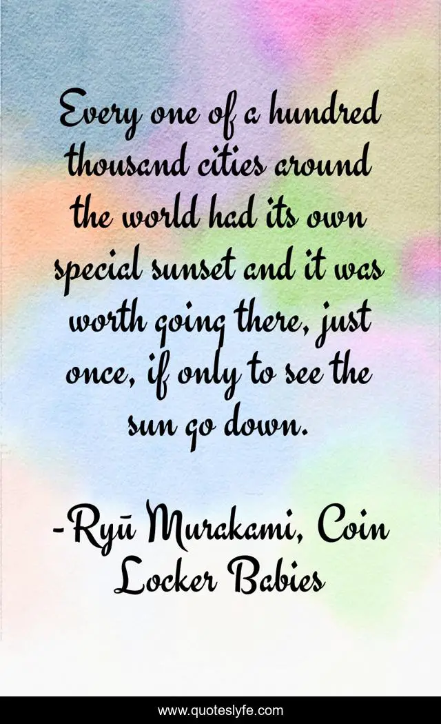 This page presents the quote "Every one of a hundred thousand cities around the world had its own special sunset and it was worth going there, just once, if only to see the sun go down.". Author of this quote is Ryū Murakami, Coin Locker Babies. .