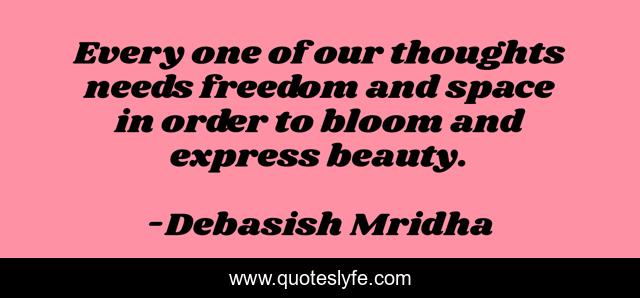 This page presents the quote "Every one of our thoughts needs freedom and space in order to bloom and express beauty.". Author of this quote is Debasish Mridha. This quote is about everyone-needs-freedom, space, freedom, freedom-and-space, philosophy, debasish-mridha, bloom-and-express-beauty, quotes, debasish-mridha-md,.