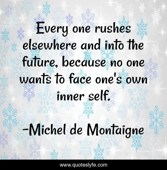 This page presents the quote "Every one rushes elsewhere and into the future, because no one wants to face one's own inner self.". Author of this quote is Michel de Montaigne. This quote is about self, inner, face,.