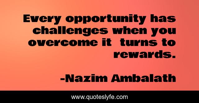 This page presents the quote "Every opportunity has challenges when you overcome it turns to rewards.". Author of this quote is Nazim Ambalath. This quote is about challenges, enthusiasm, rewards-of-passion, inspirational,.