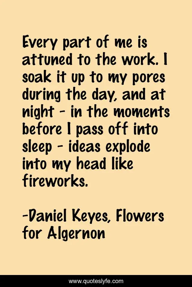 This page presents the quote "Every part of me is attuned to the work. I soak it up to my pores during the day, and at night - in the moments before I pass off into sleep - ideas explode into my head like fireworks.". Author of this quote is Daniel Keyes, Flowers for Algernon. This quote is about moments, head, work, sleep, ideas,.