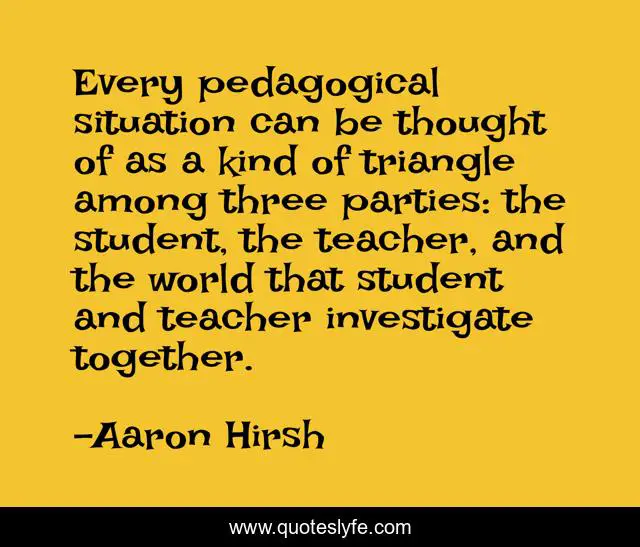 This page presents the quote "Every pedagogical situation can be thought of as a kind of triangle among three parties: the student, the teacher, and the world that student and teacher investigate together.". Author of this quote is Aaron Hirsh. This quote is about teaching, explanation, technology,.