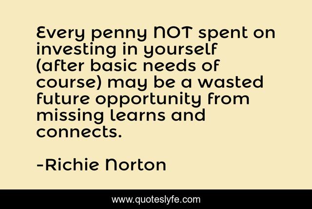 This page presents the quote "Every penny NOT spent on investing in yourself (after basic needs of course) may be a wasted future opportunity from missing learns and connects.". Author of this quote is Richie Norton. This quote is about self-love, self-hell, knowledge, money, invest-in-yourself, learn, connect, self-help, education,.