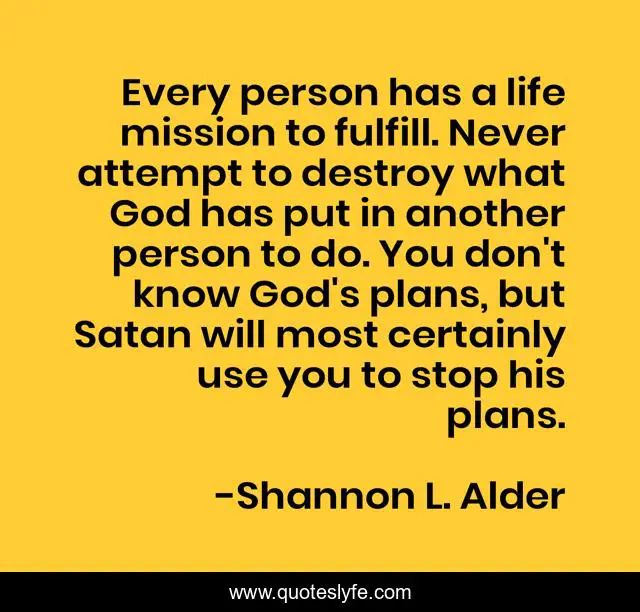 This page presents the quote "Every person has a life mission to fulfill. Never attempt to destroy what God has put in another person to do. You don't know God's plans, but Satan will most certainly use you to stop his plans.". Author of this quote is Shannon L. Alder. This quote is about forgive, move-on, forget, don-t-hurt, stop, revenge, be-kind, sith-lord, rise-higher,.