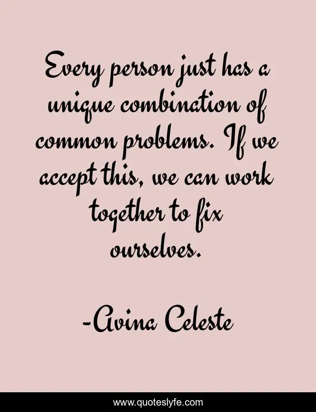 This page presents the quote "Every person just has a unique combination of common problems. If we accept this, we can work together to fix ourselves.". Author of this quote is Avina Celeste. This quote is about acceptance, problems,.