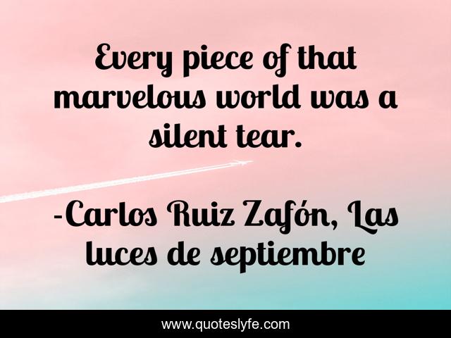 This page presents the quote "Every piece of that marvelous world was a silent tear.". Author of this quote is Carlos Ruiz Zafón, Las luces de septiembre. This quote is about sadness, magic, beauty,.