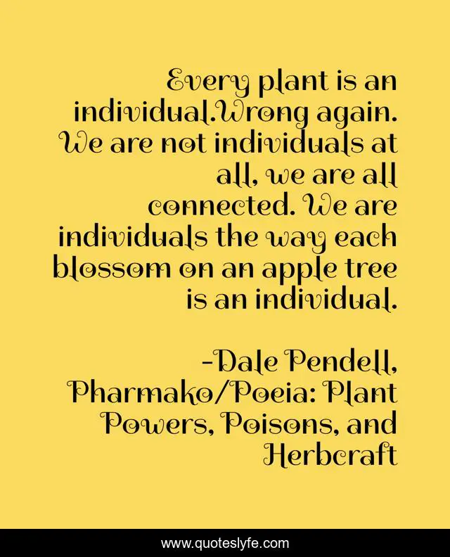 This page presents the quote "Every plant is an individual.Wrong again. We are not individuals at all, we are all connected. We are individuals the way each blossom on an apple tree is an individual.". Author of this quote is Dale Pendell, Pharmako/Poeia: Plant Powers, Poisons, and Herbcraft. This quote is about plants, botany, individuality, connectivity, existential,.