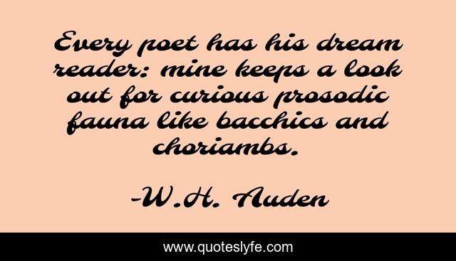 This page presents the quote "Every poet has his dream reader: mine keeps a look out for curious prosodic fauna like bacchics and choriambs.". Author of this quote is W.H. Auden. This quote is about poetry, meter, prosody,.