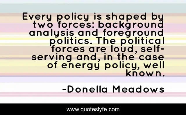 This page presents the quote "Every policy is shaped by two forces: background analysis and foreground politics. The political forces are loud, self-serving and, in the case of energy policy, well known.". Author of this quote is Donella Meadows. This quote is about political, energy, well,.