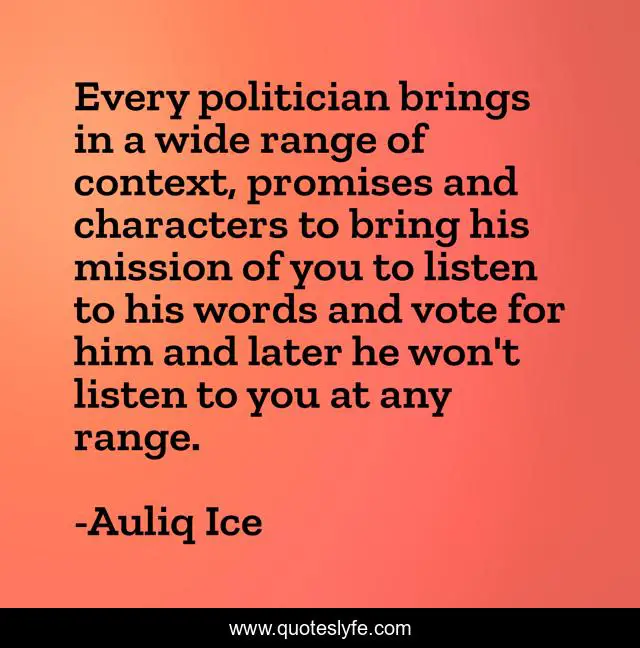 This page presents the quote "Every politician brings in a wide range of context, promises and characters to bring his mission of you to listen to his words and vote for him and later he won't listen to you at any range.". Author of this quote is Auliq Ice. This quote is about politics, politicians, political-philosophy, liars, politics-of-the-united-states,.