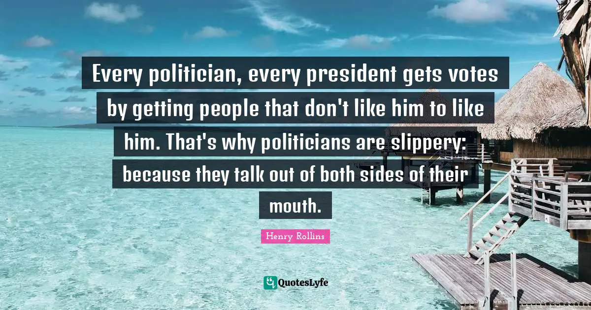 This page presents the quote "Every politician, every president gets votes by getting people that don't like him to like him. That's why politicians are slippery: because they talk out of both sides of their mouth.". Author of this quote is Henry Rollins. This quote is about people, both sides, slippery, president, politician, mouths,.