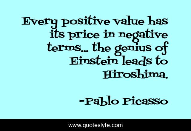 This page presents the quote "Every positive value has its price in negative terms... the genius of Einstein leads to Hiroshima.". Author of this quote is Pablo Picasso. This quote is about genius, negative, value,.