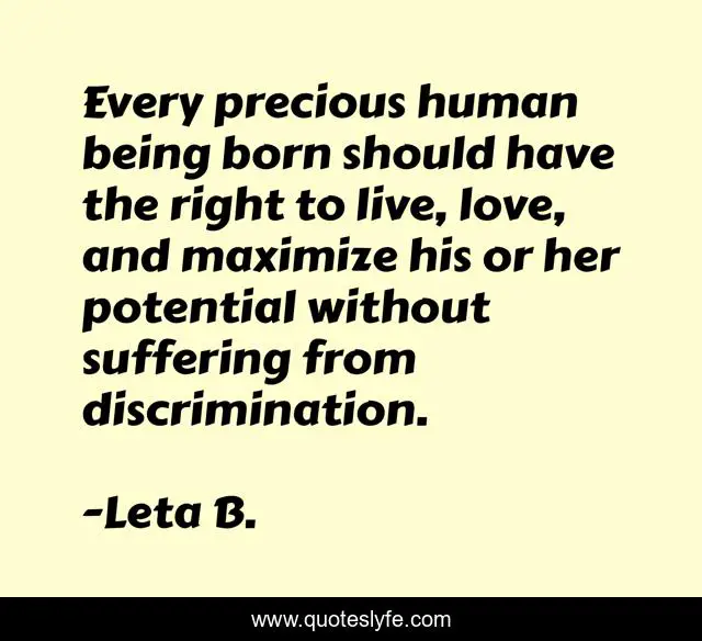 This page presents the quote "Every precious human being born should have the right to live, love, and maximize his or her potential without suffering from discrimination.". Author of this quote is Leta B.. .