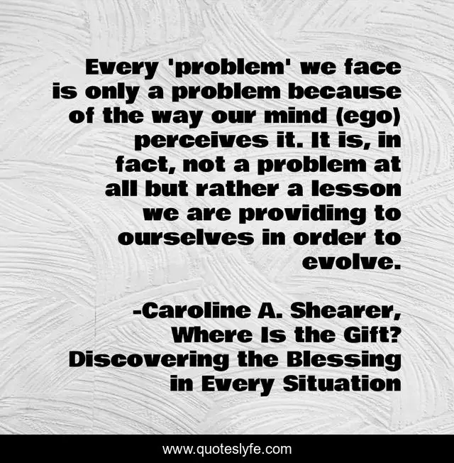 This page presents the quote "Every 'problem' we face is only a problem because of the way our mind (ego) perceives it. It is, in fact, not a problem at all but rather a lesson we are providing to ourselves in order to evolve.". Author of this quote is Caroline A. Shearer, Where Is the Gift? Discovering the Blessing in Every Situation. This quote is about law-of-attraction, happiness,.