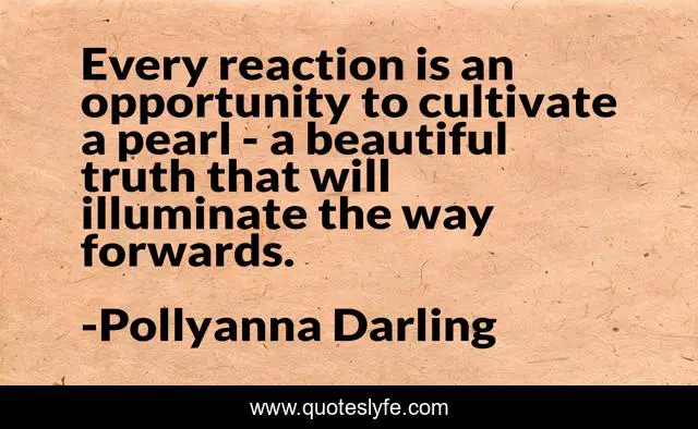 This page presents the quote "Every reaction is an opportunity to cultivate a pearl - a beautiful truth that will illuminate the way forwards.". Author of this quote is Pollyanna Darling. This quote is about reaction, truth-of-life, opportunity,.