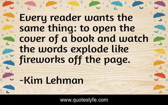 This page presents the quote "Every reader wants the same thing: to open the cover of a book and watch the words explode like fireworks off the page.". Author of this quote is Kim Lehman. This quote is about readers, reading-books, fireworks, writing, books, reading,.
