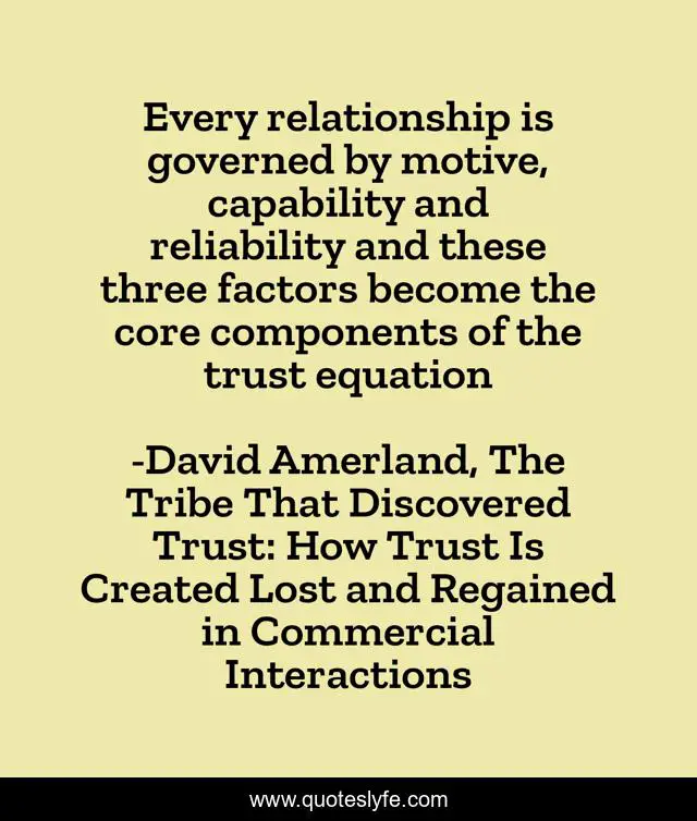 This page presents the quote "Every relationship is governed by motive, capability and reliability and these three factors become the core components of the trust equation". Author of this quote is David Amerland, The Tribe That Discovered Trust: How Trust Is Created Lost and Regained in Commercial Interactions. This quote is about relationships, trustworthy, trust,.