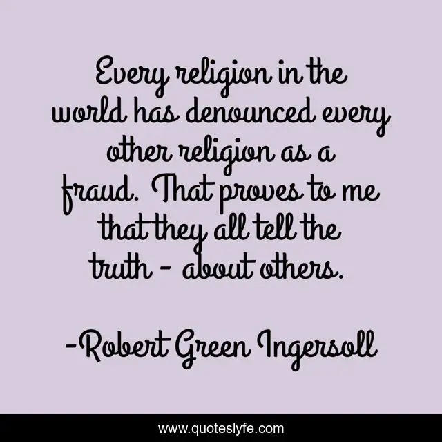 This page presents the quote "Every religion in the world has denounced every other religion as a fraud. That proves to me that they all tell the truth - about others.". Author of this quote is Robert Green Ingersoll. This quote is about me, world, truth,.