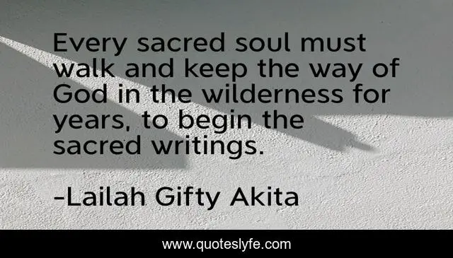 This page presents the quote "Every sacred soul must walk and keep the way of God in the wilderness for years, to begin the sacred writings.". Author of this quote is Lailah Gifty Akita. This quote is about life, wilderness, god, motivational, spiritual, writing, writers, optimistic, positive,.